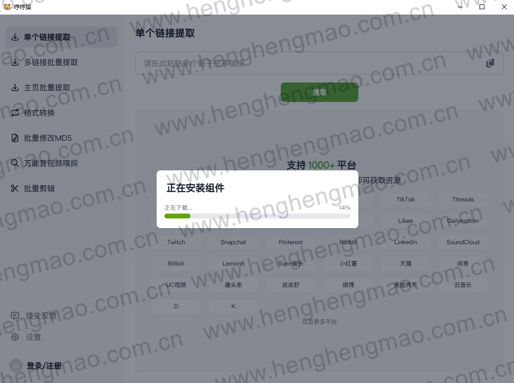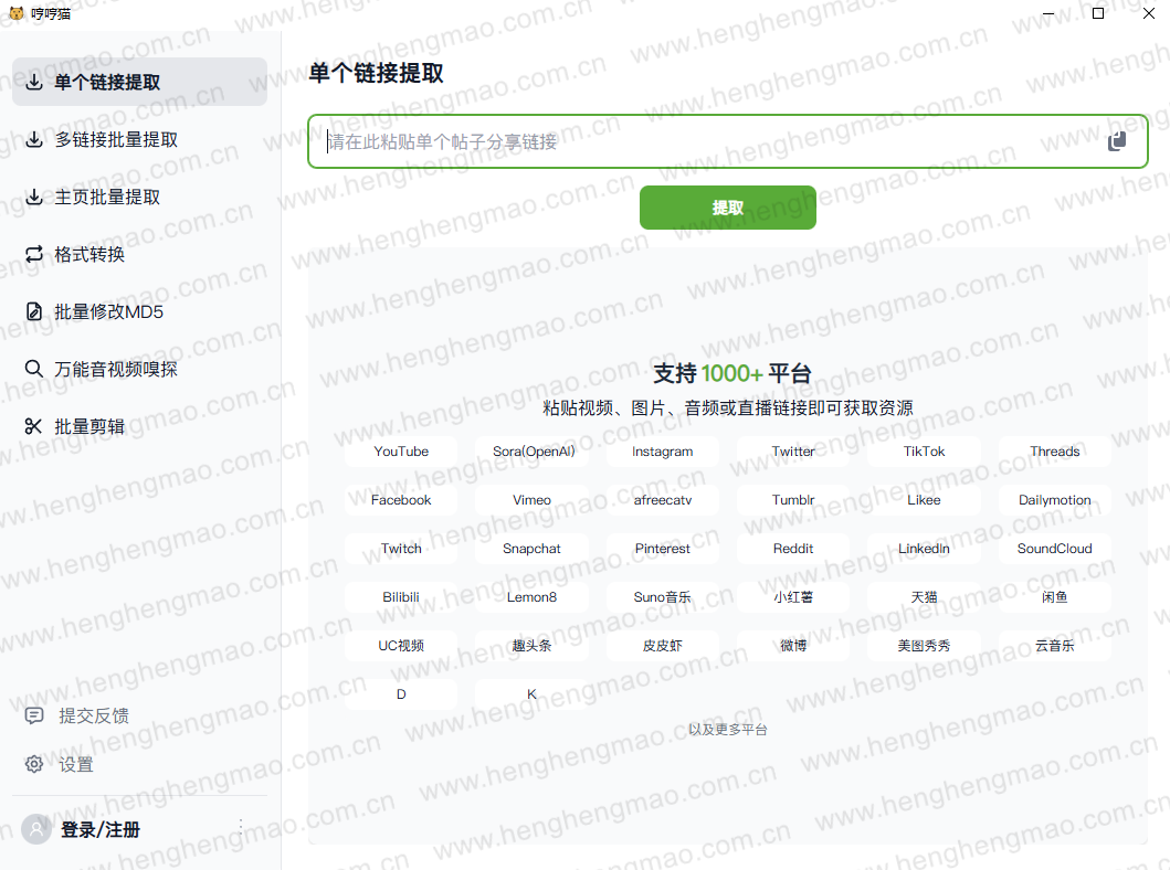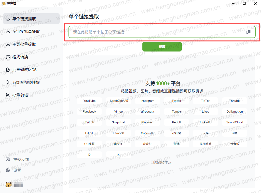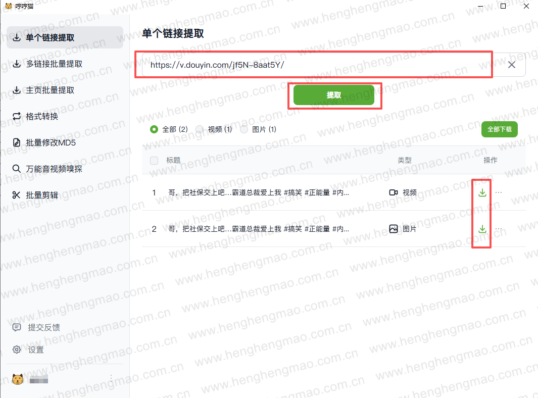 将要去除水印视频的链接添加到里面,点击提取即可自动解析。