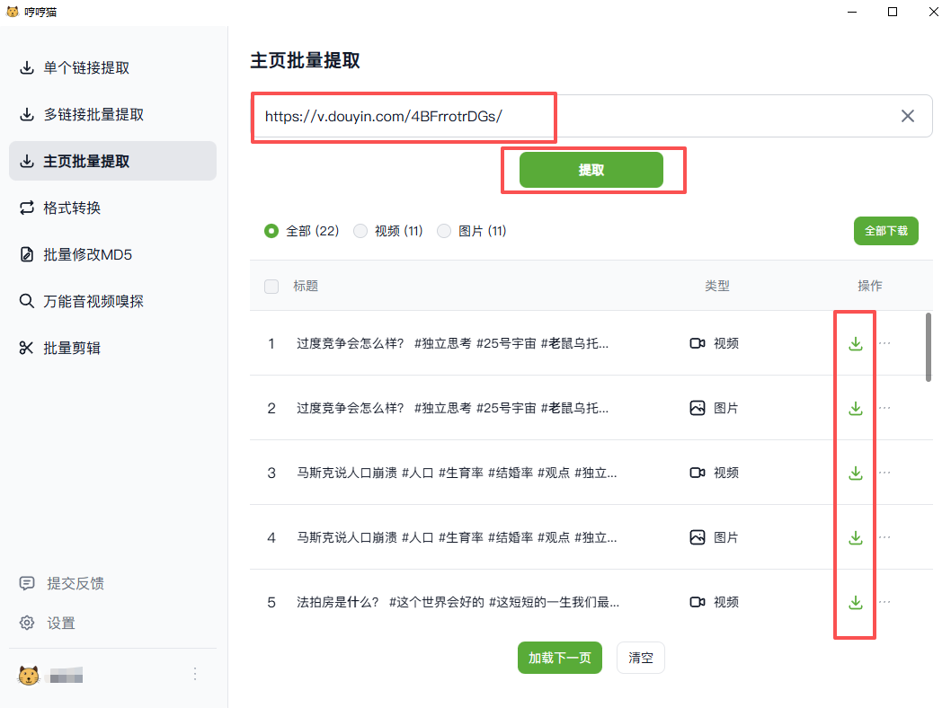 主页批量提取,就是在视频作者的主页复制其主页链接,然后一次性解析下载该账号的全部视频。