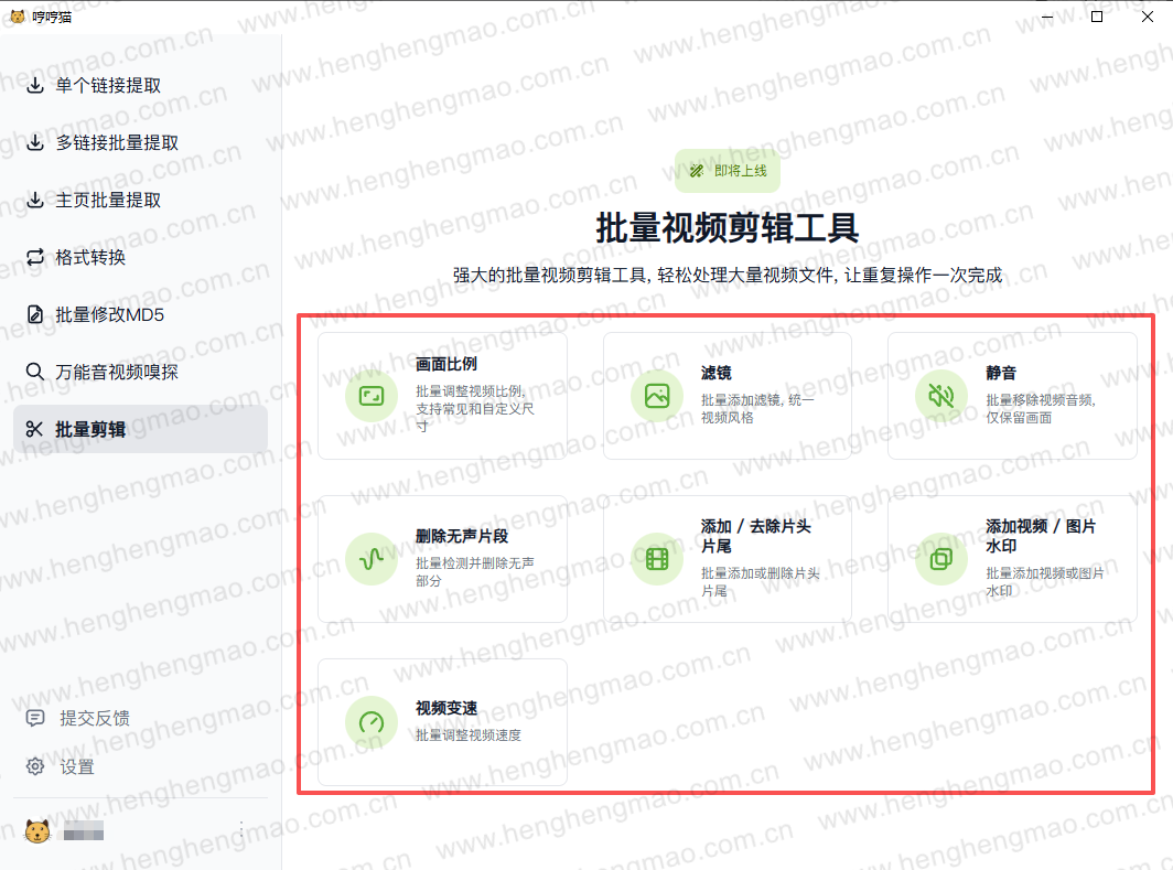 批量剪辑功能也在开发中,后续可以直接在软件中实现视频画面比例调整、添加滤镜、静音、删除无声片段、添加去除片头片尾、视频添加水印等功能。