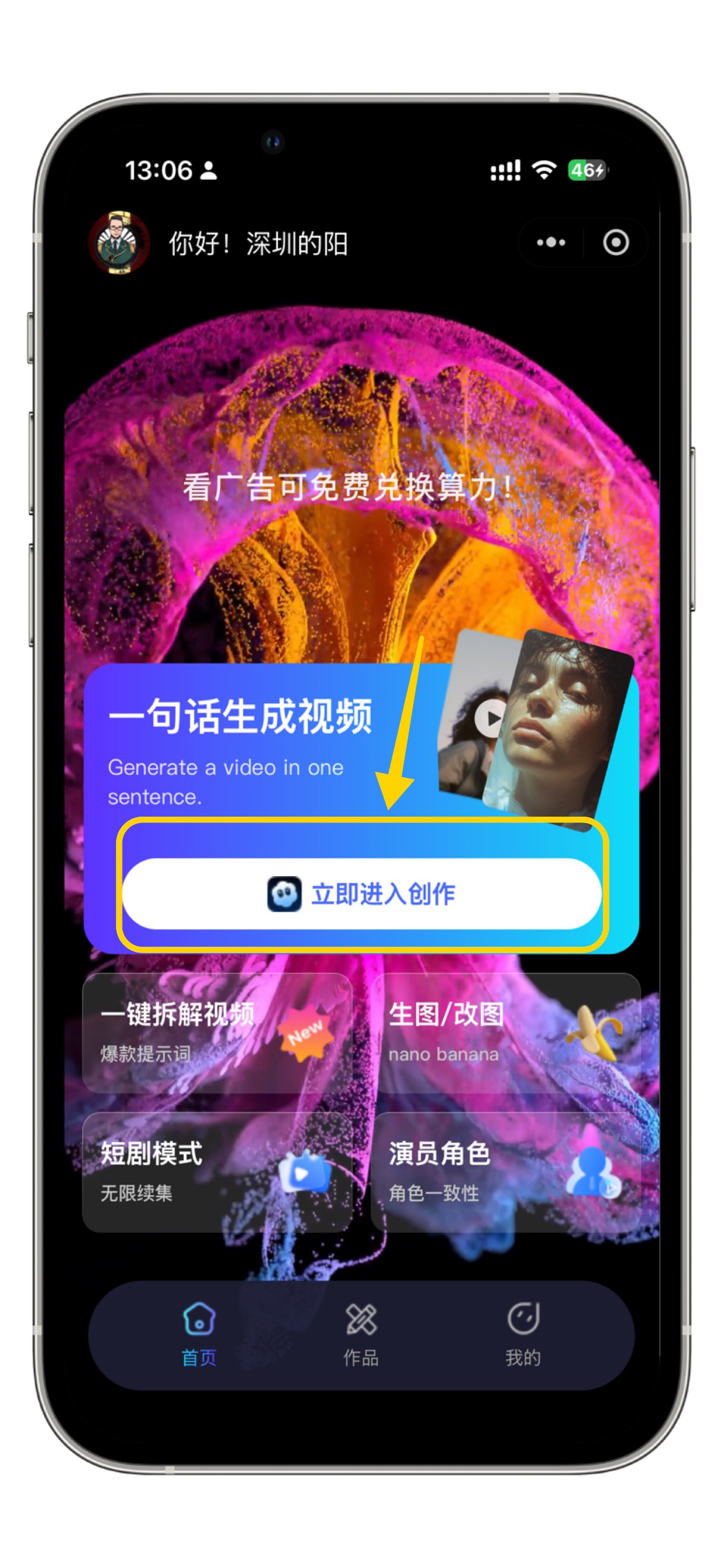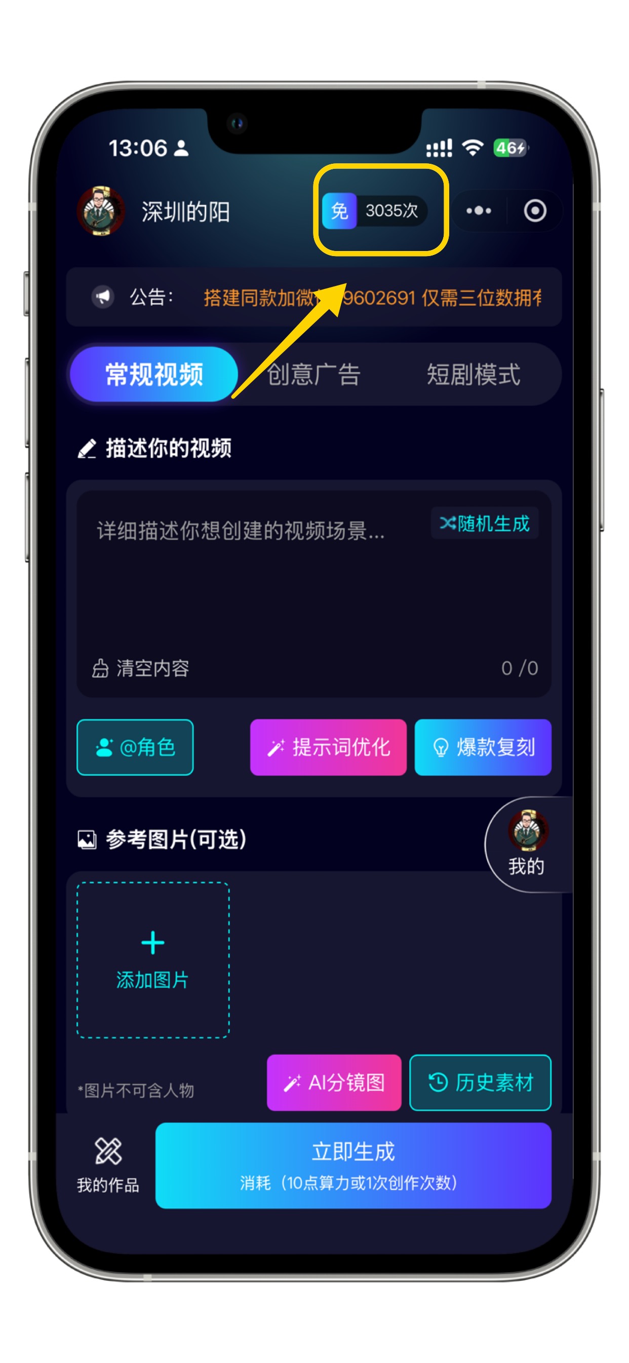 并修复了之前无法弹出激励广告的BUG,目前可以通过看广告兑换视频生成算力,不充值也可以通过这种方式获取算力,通过这种方式您将无需购买任何套餐就可以免费使用我们的小程序生成AI视频。