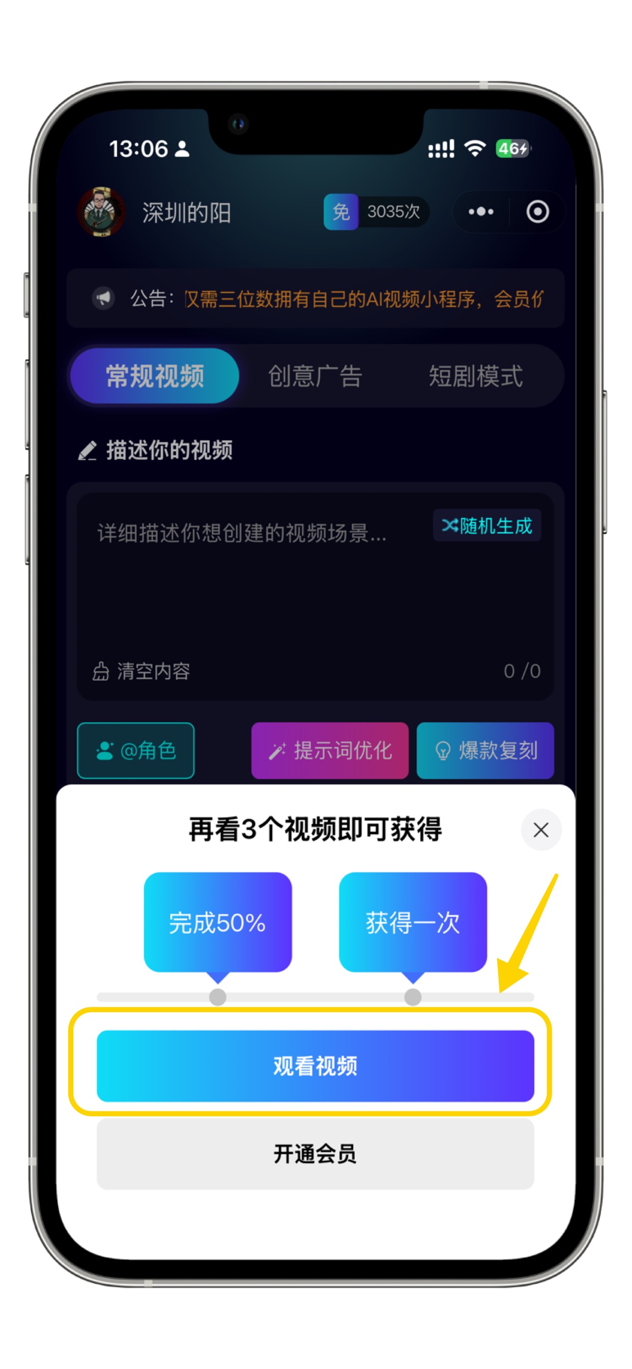 点击「观看视频」即可自动弹出激励广告,观看次数累计达标后会自动赠送视频生成算力,从而实现永久免费使用。